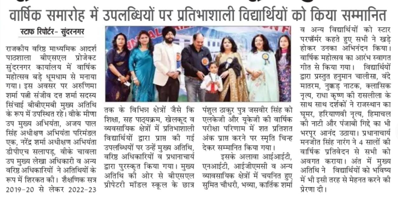Situated in the serene and picturesque hills of Sundernagar with a bracing climate, Govt Sr. Sec. Model School, with the motto "LEARN, LEAD, ACHIEVE & SERVE," has always been on its untiring, perpetual march to touch the higher pinnacles of excellence and glory. The pioneer efforts of starting this institution were undertaken by Ms. S. Malik in 1967. A seed was sown, which soon germinated and sprouted in the shape of a mini institution housed in residential quarters. It was named a Junior Model School. Admission to the classes up to middle and higher standards started simultaneously in 1969. In the same year, the school was named a Senior Model School. In March 1971, the first batch of four students appeared in the Matriculation examination conducted by the Punjab School Education Board, and two students were placed on the merit list.
